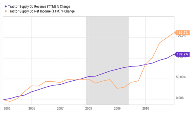 Ma usun, et Tractor Supply võib majanduslanguse ajal hästi toimida, osaliselt seetõttu, et tal läks hästi suure majanduslanguse ajal, nagu näitab järgmine graafik.