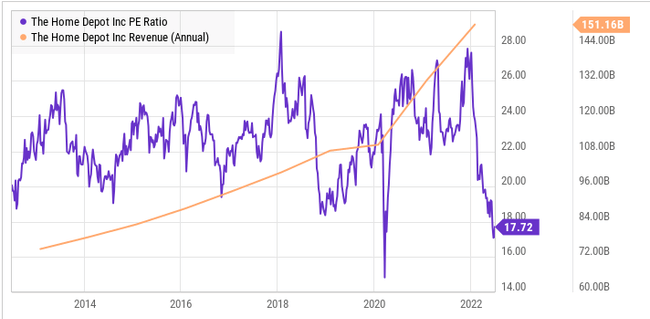 Üks sellise languse eeliseid on see, et tuntud ja edukate ettevõtete aktsiad langevad. Mõelge sellele, mida te juba teate, et see toimib. Võtame näiteks Home Depot $HD, mille aktsia kaupleb oma hinna ja kasumi suhtarvu (P/E) alusel väärtusel, mida ta on viimase 10 aasta jooksul vaid üks kord saavutanud. See on ettevõte, mis on selle aja jooksul oma aastatulu kahekordistanud.
